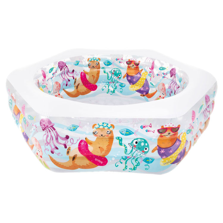 استخر بادی شش ضلعی آکواریوم اینتکس 56493 برای کودکان ۶+ سال مناسب است و ۵۵۰ لیتر آب را در خود جای میدهد. طول و عرض این محصول به ترتیب ۱۹۱ و ۱۷۸ سانتیمتر است. ارتفاع کلی استخر بادی آکواریوم اینتکس ۶۱ سانتیمتر است که ۵۰ سانتیمتر آن را آب فرا میگیرد.