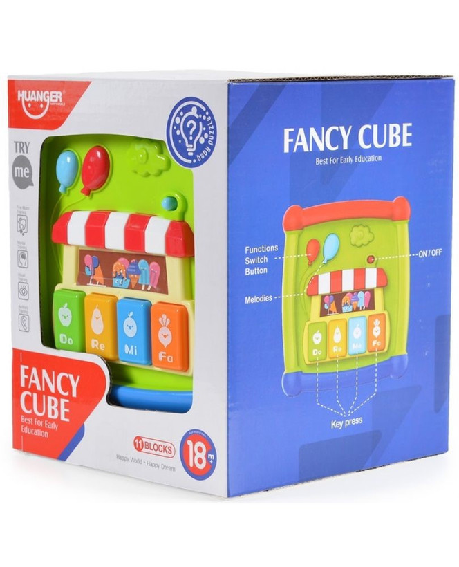 یک وجه مکعب دارای دکمه های موزیکال برای پخش ملودی های مختلف کودک پسند است
