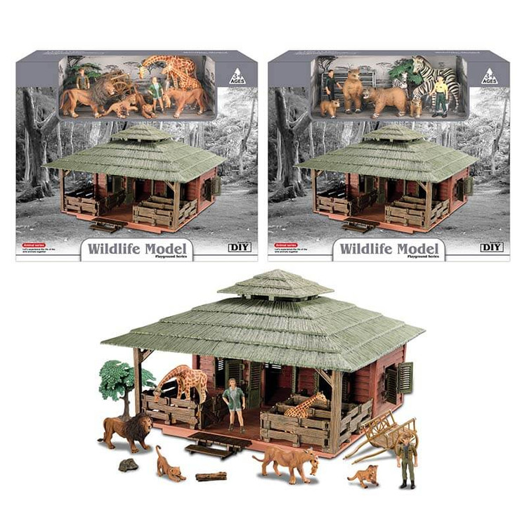 کلبه جنگلی ساختنی با تعدادی فیگور حیوان وحشی